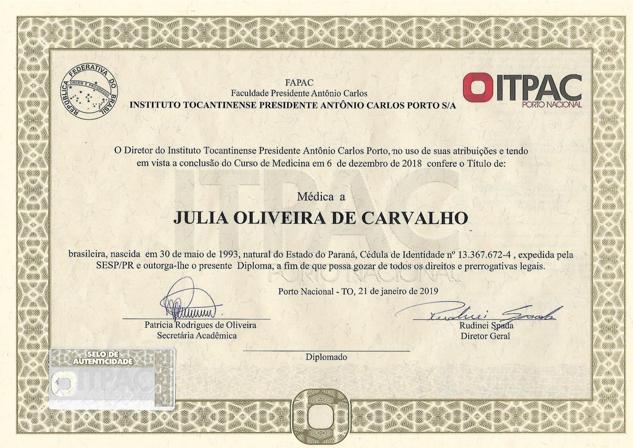 Olá, meu nome é Júlia Oliveira de Carvalho, mas pode me chamar de Doutora Júlia.